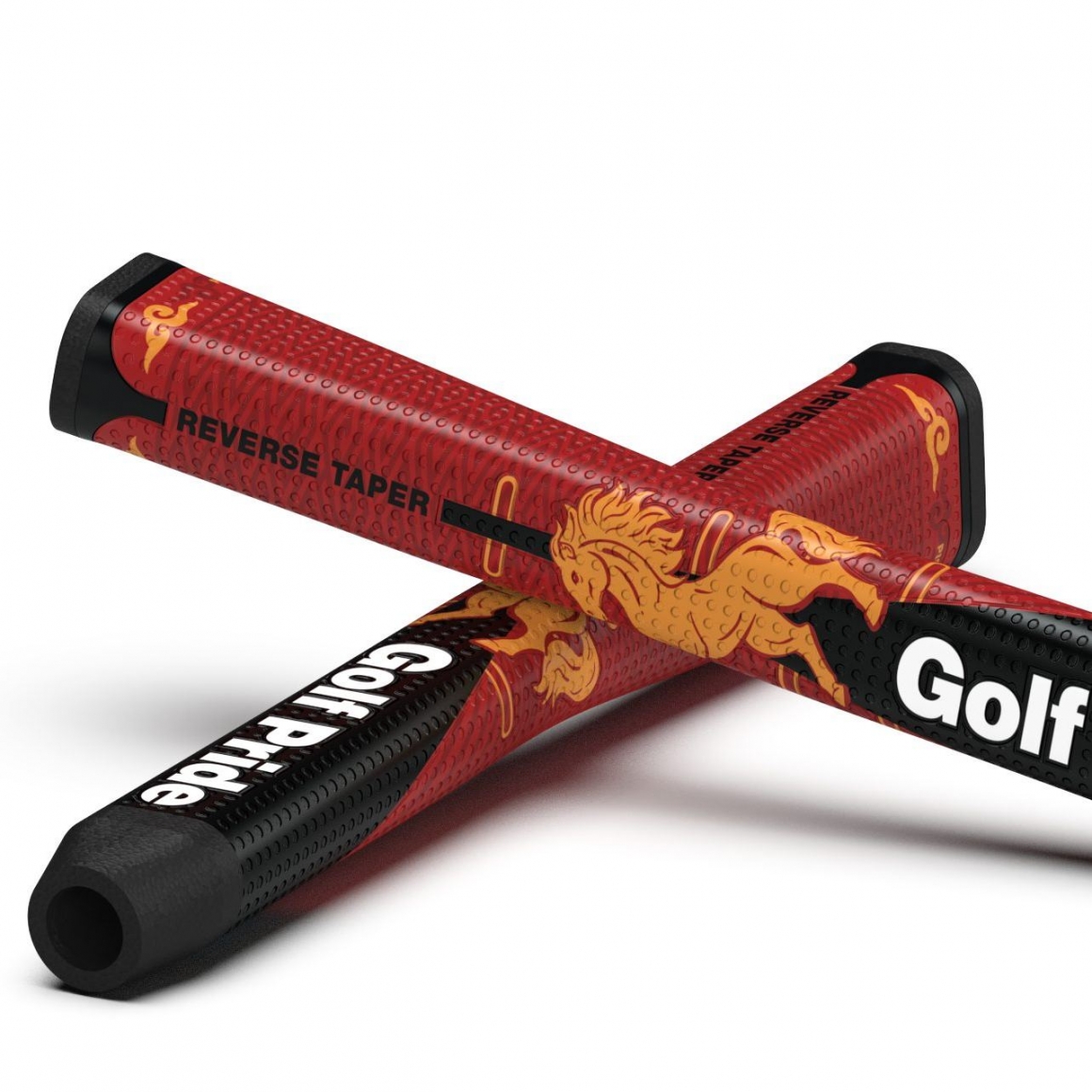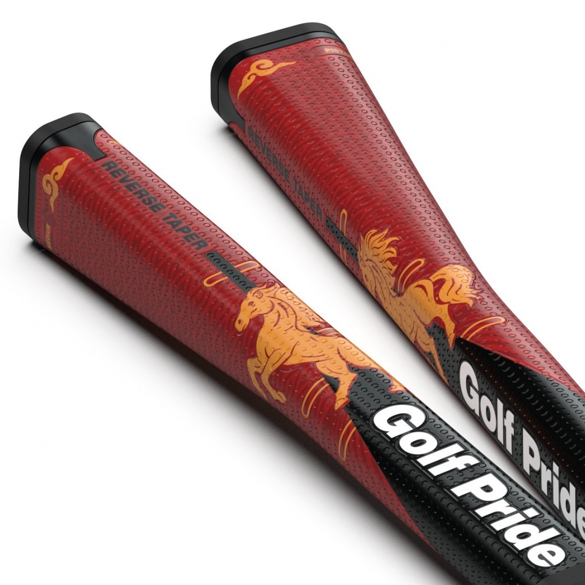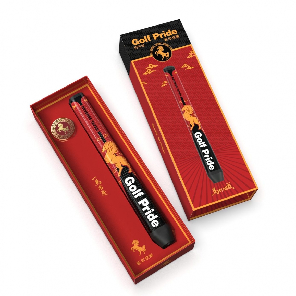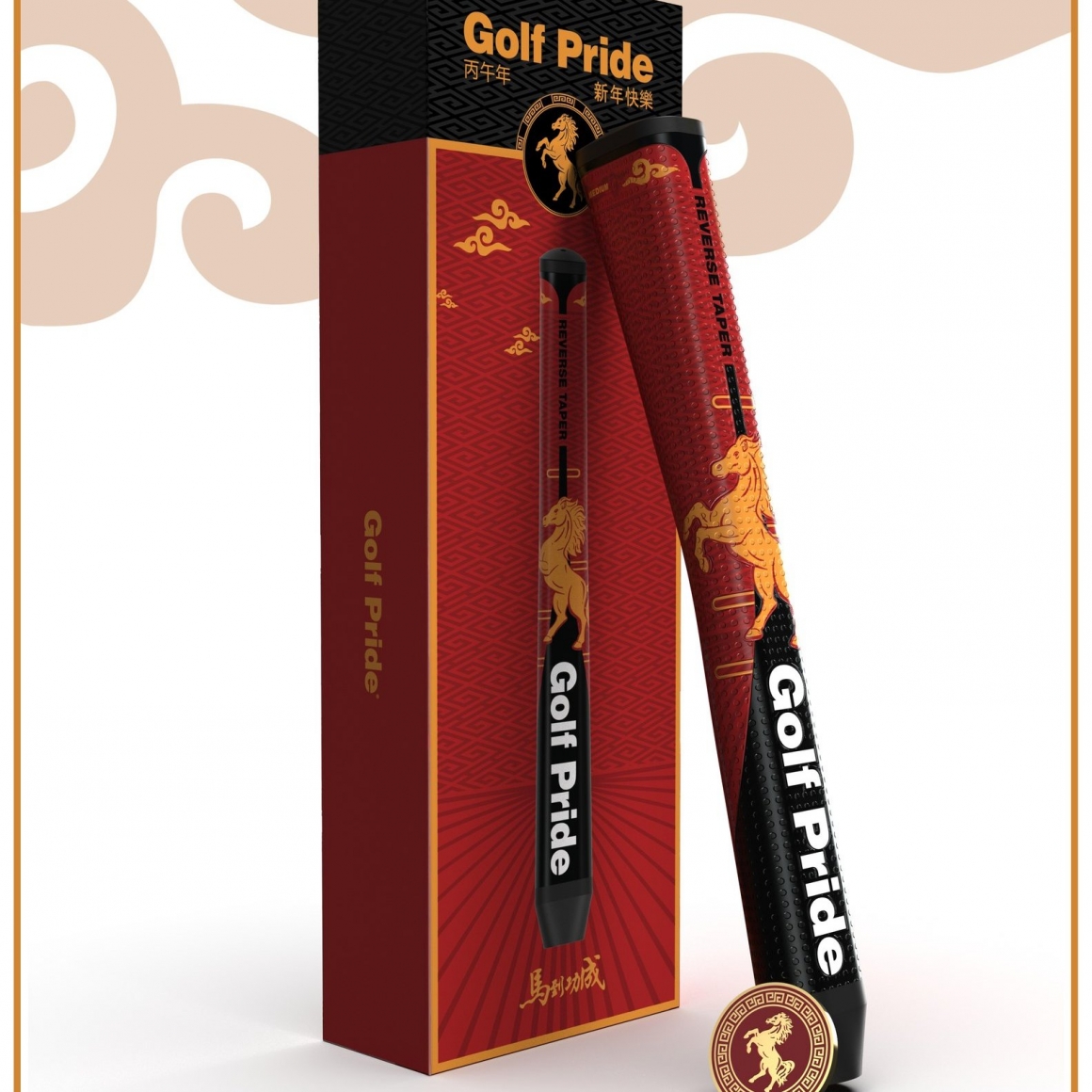 這款馬年限定 Reverse Taper 推桿握把,以紅 ∕ 金 ∕ 黑的喜慶配色,搭配駿馬與祥雲圖騰,寓意「馬到成功」,吉祥又霸氣